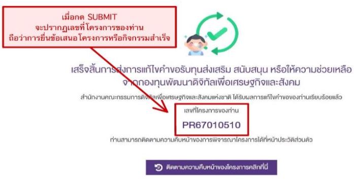 คำตอบ เมื่อกรอกรายเอียดโครงการ ผ่านระบบออนไลน์ได้ที่ https://defund.bde.go.th หรือ https://defund-rt.bde.go.th/auth/login เสร็จเรียบร้อยแล้ว สามารถตรวจสถานะ การยืนยันส่งแบบคำขอสำเร็จ/ไม่สำเร็จ เมื่อ Submit แล้ว จะมีเลข PR67001XXX จะถือว่า ท่านได้ดำเนินการยื่นขอรับการส่งเสริม สนับสนุนฯ ผ่านระบบสำเร็จ