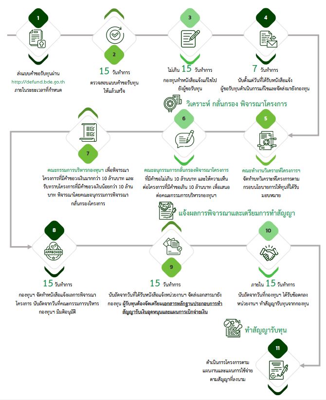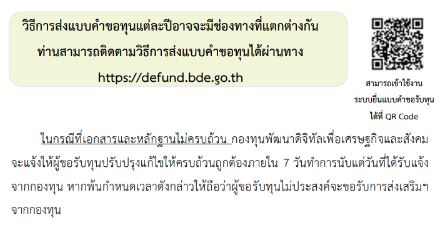 คำตอบ ผู้ที่ยื่นขอรับการส่งเสริม สนับสนุนฯ จากกองทุน สามารถเข้าตรวจสอบสถานะโครงการได้ที่ https://defund.bde.go.th หรือ https://defund-rt.bde.go.th/auth/login