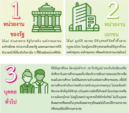 เอกชน ได้แก่ มูลนิธิ สมาคม นิติบุคคลที่จัดตั้งขึ้นตามกฎหมายไทย ซึ่งผู้แทนนิติบุคคลจะต้องมีสัญชาติไทย และองค์กรชุมชน องค์กรเอกชน หรือองค์กรสาธารณประโยชน์