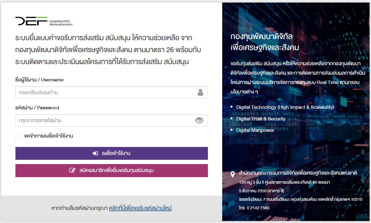 ขอรับทุนส่งเสริม สนับสนุน หรือให้ความช่วยเหลือ จากกองทุนพัฒนาดิจิทัลเพื่อเศรษฐกิจและสังคม
